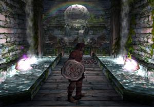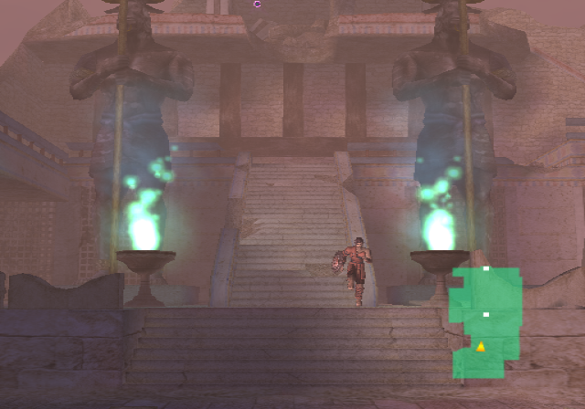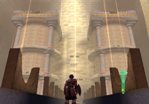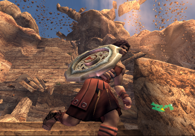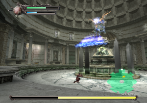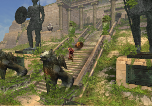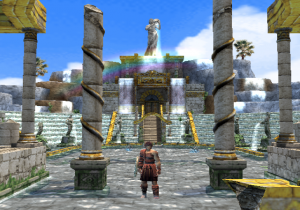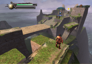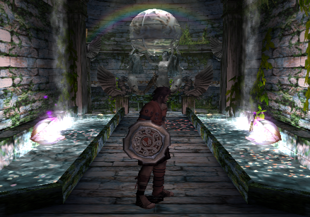 Onto the graphics. The PlayStation 2 was about two years old around this time, and programmers had begun to realize its full graphical potential. Thus, the game looks nothing short of gorgeous. It really looks like Ancient Greece, taken from the pages of Sophocles or Euripedes. Crumbled statues litter the ruins of the Coliseum, shrubbery and pools of water line up beneath the walls, and the sunlight of the rising dawn bathes it all in a golden color. There’s this one angle of the camera that displays the background… of the beautiful sun, Apollo’s brainchild, incipient in its existence of the new day. It shines as preciously as it did in the arcade and NES games, even more so in 3D! (That’s not the only homage, either – Rygar needs to move those same silly looking urns just like his arcade counterpart.) That’s just the beauty of the first stage; it never lets up all throughout. A lush green field with fallen columns everywhere serves as the main hub that pretty much connects to everywhere else, Poseidonia’s Shrine is absolutely steeped in lush waters that refract light every which way (and generate rainbows every now and then!), and wait until you get to the Lion’s Road, which is almost definitely a tribute to the floating isles of Lapiz.