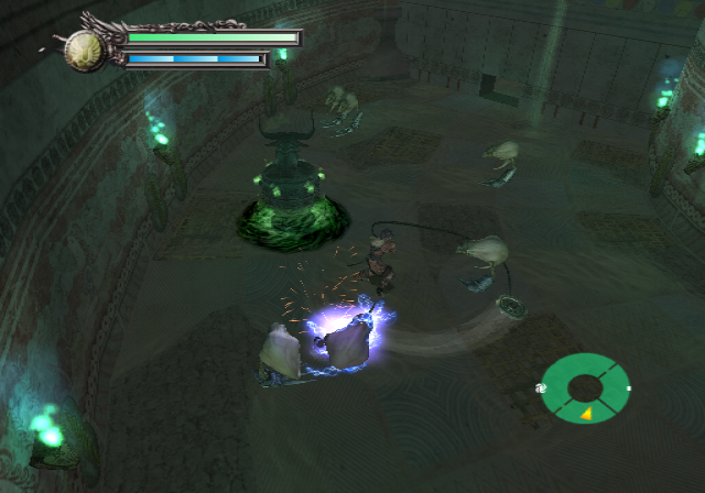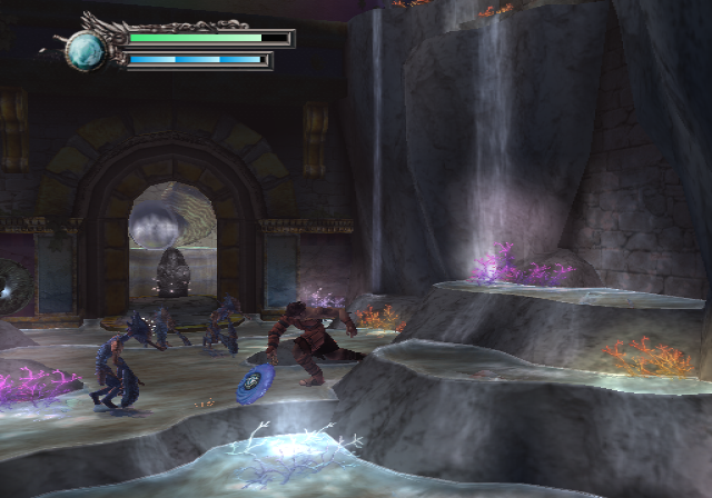 As Rygar goes on, the true power of his plain Diskarmor becomes realized, and it becomes the fancier and stronger Hades Diskarmor. Along with this change comes the addition of the Icol meter. Icol allows the spirit resting within the Diskarmor to burst out and cause good damage to the enemies in the imminent area. A little more on that later. Not too long after the Hades Diskarmor is brought to fruition, Rygar stumbles across another diskarmor! He has to earn the Heavenly Diskarmor in a brutal boss battle, but after getting it, Rygar obtains a whole new movelist. Instead of thrusting straight out, the Heavenly Diskarmor is swung to the sides with the purpose of clearing out multiple enemies surrounding our hero. Holding the square button allows for the still spinning H.D. to be controlled with the left analog and ward off enemies in front. The Remote is hardly as cool as the Snap, unfortunately.