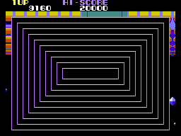 As you pointed out, Robotron 2084 had a significant influence on NOVA2001. I wanted to create a 360 degree omni-directional shooter such as Robotron 2084. However, due to the cabinet design that was common in Japan at the time, we were unable to put in dual joysticks. So by pressing a button, you could fix your ship’s orientation. The “stage clear” effect was a conscious imitation of Robotron 2084. That used full graphic system hardware, but this used character generator system hardware, so I was unable to replicate it exactly, but I think it looks close enough. (laughs) I used a lot of trial and error to replicate the “Gyuoon, Gonononono” sound effects. The sound hardware was completely different, but again I was able to create something that was not exactly the same, but close enough. (laughs)