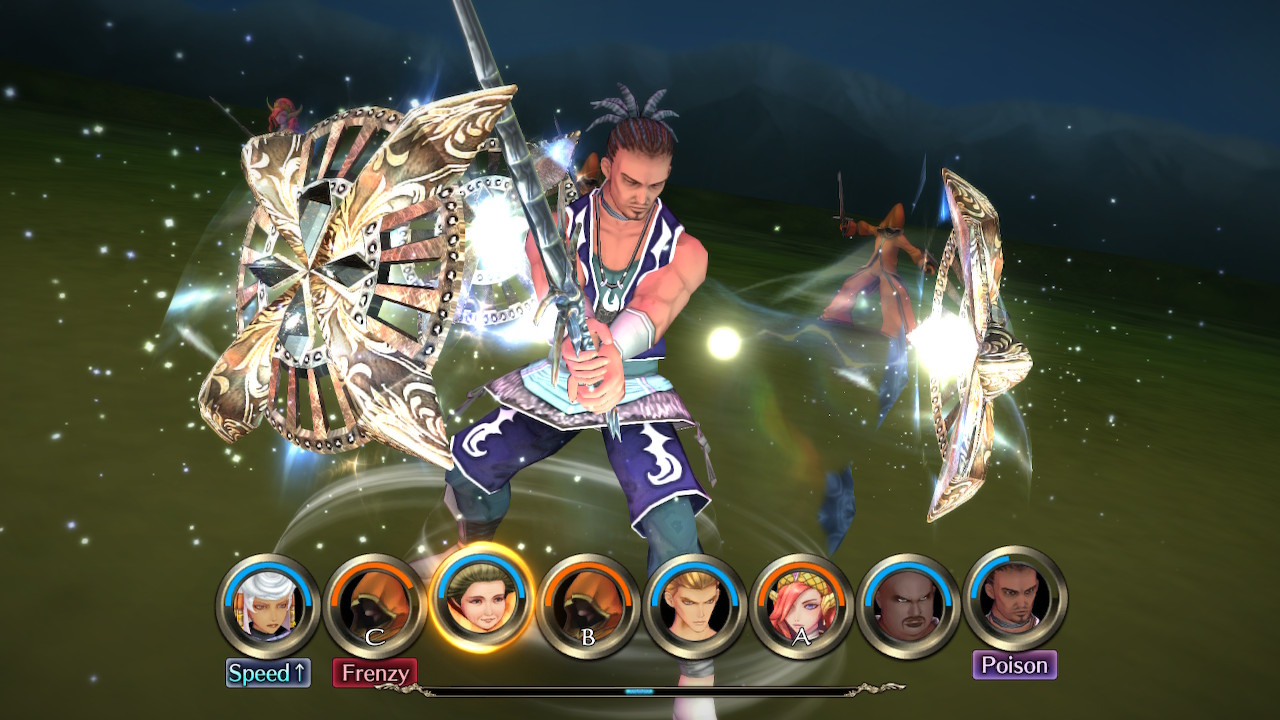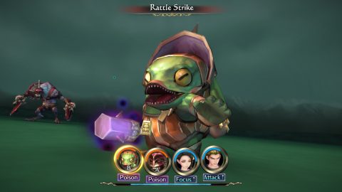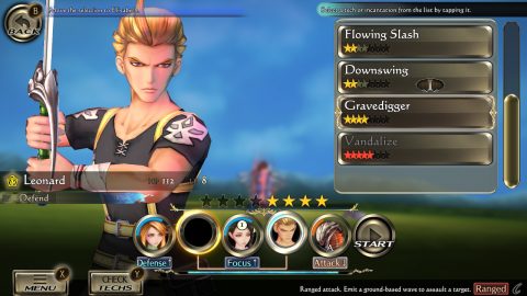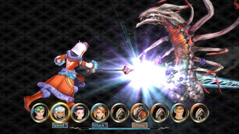 The real benefit of moving your characters up and down in turn order is setting up United Attacks and preventing enemy ones. In addition to being the order of battle, that time line at the bottom of the screen is also like the positioning of your team relative to the enemy on a single axis. If you can surround and then eliminate that solitary goblin, your teammates smash together in a pincer attack to fill in the gap leading to a free hit and a BP discount on the next turn for all participants. This grants massive momentum to your team, opening up some of your strongest abilities with that BP discount on your next turn. Thus, isolating monsters on the enemy team and eliminating them on the same turn is the basic strategy you will aim for, requiring you to look for opportunities and flex your action choices to create those openings. Of course the player is also avoiding their own characters getting isolated and killed, as the enemy AI can also exploit United Attacks competently. This mechanic opens up a possible comeback play of goading the enemy to kill a weakened teammate (or allow them to die due to poisoning) that is right in the middle of two of your own allies, who can then retaliate with a United Attack and momentum swing of their own.