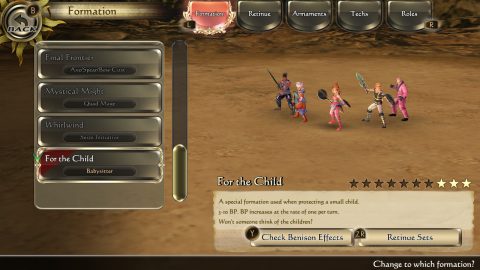 Other features of combat will also prove essential to success. A major departure from similar games is the diminished role of healing during battle. Healing is exclusive to magic and you will need to prepare healing one or more turns in advance. Often it is much better to prevent damage than it is to heal it later, because restoring HP as an emergency, reactionary move is not available after a bad turn. Magic always requires forward thinking as casters must chant for at least one full turn before a spell is unleashed. While experienced mages have the largest toolkits of any characters, novice mages can be tedious to foster in most circumstances. And we haven’t even talked about the status effect system which opens up even more options and ways for your team to work together, disable tough foes, or goad the enemy into inefficient turns. If you want your path to an efficient and satisfying victory to involve more than just damage numbers – and include plenty of meaningful decisions – this is a wonderful game to explore.