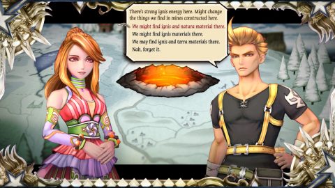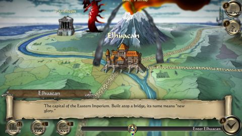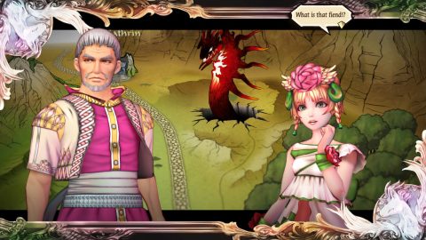 The world of Scarlet Grace is introduced in a cut scene (absent in the mobile version and strangely requiring players to play it manually on the PC version) featuring striking pans across a mosaic depicting the world’s vast history. The Firebringer, (a promethean figure who has literally fallen from grace) opposes the Emperor chosen by the twelve Celestial gods of the world. The game picks up after this empire succeeds in finally striking down the Firebringer, thus losing its uniting purpose and collapsing into bickering between the great houses. The four protagonists set off to explore the vast regions of the world, getting clues about the real story behind the motives of all these divine beings and uncovering mysteries in each of the game’s regions.