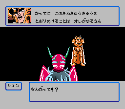 At the end of an action section you come across a boss and here’s where the fun begins. You have several options: attacking, talking, observing your status, and summoning one of the other characters. Depending on the character, there may be different attacks to choose from. Using the attack option seems to be based on pressing the appropriate directional buttons at the time you cast it, but it’s hard to tell for sure. After an attack the enemy might say something and… He does an attack that always seems to hit.