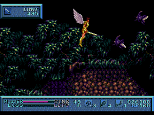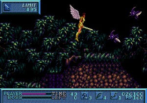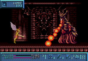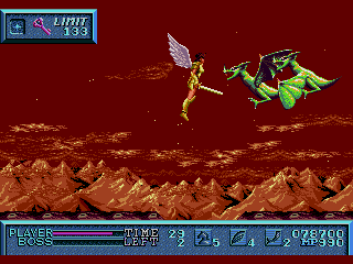 For the first three “chapters”, a boss battle follows each level. In general the bosses are designed to be fought in a specific form. Usually it’s the angel – you can’t beat flying to dodge attacks – but there’s a fight with a giant sea worm for the merman, and a duel with a speedy centaur that can easily be trapped in a corner if you turn into a centaur yourself. They’re usually extremely easy, but a few of the bosses are only vulnerable in specific spots for short moments, without much in the way of logic or visual cues to guide you, resulting in battles that can be annoying and confusing the first time around.