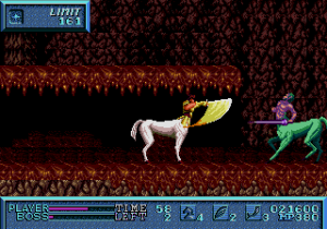 Throughout the game, you collect animal icons from defeated enemies, which you can then use to take on different forms. As a centaur, you gallop at high speeds and jump far and high; while useful in a few set situations, using it during regular gameplay is risky, as it tends to run into enemies and obstacles and the huge sprite makes it an easy target. The angel, of course, can fly, letting you get around with ease while avoiding grounded enemies. Dragons can usually be found flying at the very top of most levels, and killing them often nets you healing items. Finally, the merman form lets you swim faster and replaces the regular sword swing with a more precise stabbing motion. You can stock up to five of each icon, and a transformation last 60 seconds; a timer counts down the seconds left, so you can simply use another icon before you run out if you want to remain in that form a while longer. In general, there’s plenty of them to be found.