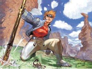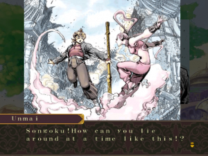 Daiseiou is the Japanese name of a Hong Kong comic book based on the The Monkey King legend. Since Starfish already had the basic engine in place, they probably figured it would be a brilliant idea to grab the license and make a more “mature” sequel to their previous game, where all the villains travel in giant air fortresses and space vehicles, and the hero’s cloud turns into a scantily-clad genie for the cutscenes. In the US the game was once again disenfranchised, and released as Saint.