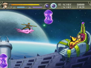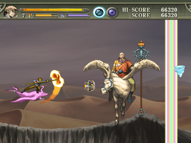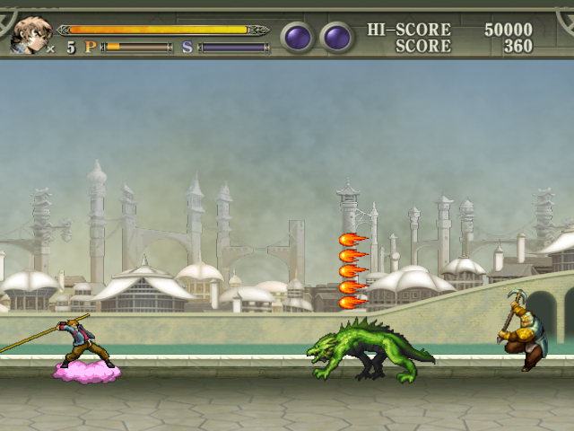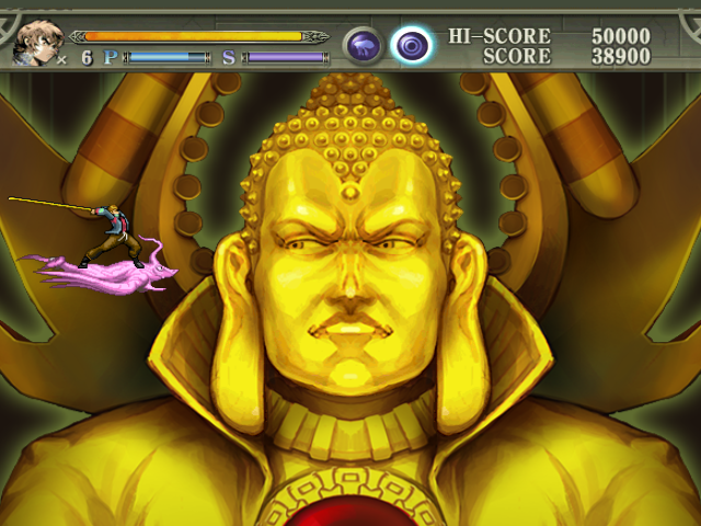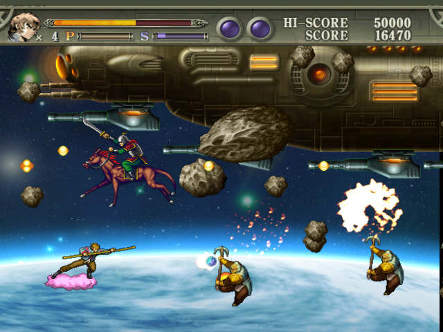 Saint may be more versatile than Monkey King, but none of the parts really work, and especially the big sprites with unforgiving hit detection make it an exercise in frustration. It can be played by three players at once, but even alone the screen often becomes an unintelligible mess. On the Normal difficulty levels the bosses take a ridiculous amount of abuse, while on Easy everything is just mind-numbingly dull and meaningless. Who would have thought that a mediocre game plus license plus half-hearted genre shifts would not make a classic?