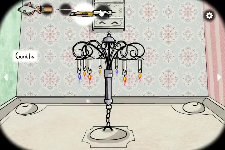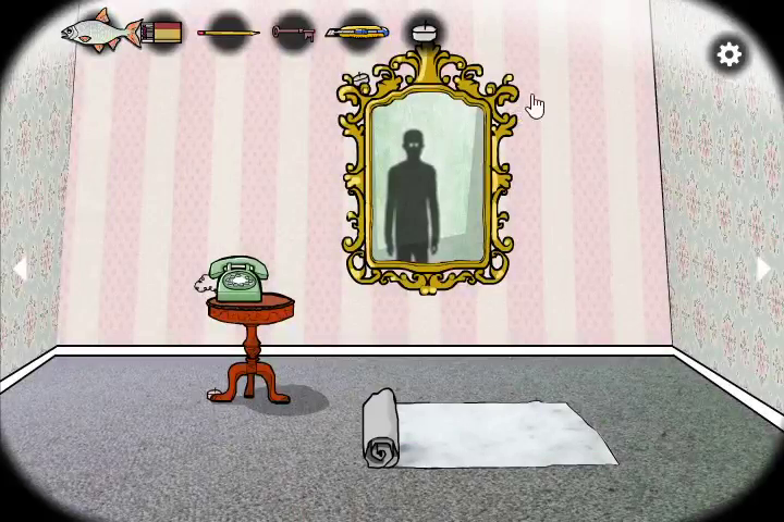 The game starts with the player looking around a mostly-empty room drawn at odd angles, where they are left to their own devices. We plunge into surrealist puzzles very early on, and the only real hints the player is given to their solutions come from the ever-chatty telephone. The general gameplay loop went on to inspire Seasons: find five of a certain object (candles, shells, and so on, instead of photographs like in Seasons) and then find one key object to complete a ritual of sorts to move on to the next stage. In Samsara Room, this involves moving through a rusty, iris porthole the player discovers in the wall at one point, after which the player transforms into some other lifeform, and has to re-explore the room from this new perspective (the game filling the room with water for your transformation into a fish!).