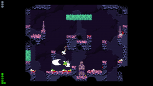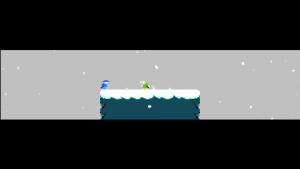 The battle arenas are divided into four domains. Forests have foliage which can be cut down or act as platform. Sometimes they hide rocks, which turn into spikes if you hit them again. The frozen lands contain large icicles that fall off when hit, potentially killing an opponent; once fallen, they can act as temporary shields. Some of them also have water around the bottom, which renders your gun unusable until you respawn. There’s a domain made of strange mechanisms and wooden platforms; these move on their own to crush anyone who gets stuck behind (or beneath), but they can be turned around by firing at them. The last type of area is dark and filled with gravestones and Buddah statues. Bright green vegetation hangs from parts of the ceilings; you can hang from it and fight upside down.