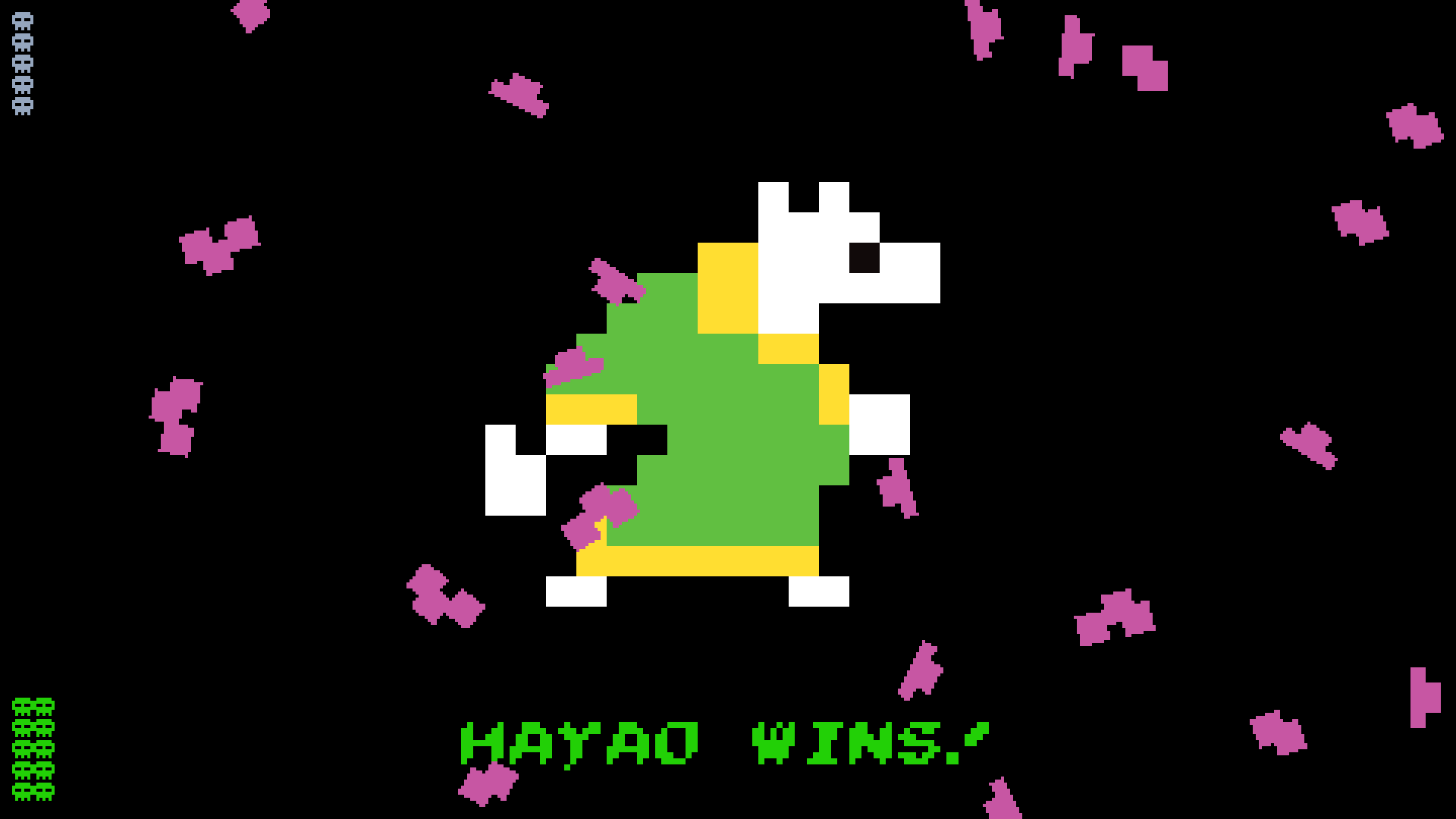 A dark, horror-themed rap song plays over the stylish title screen, but the music in-game is minimalistic, one of many elements suggesting a Bushido Blade influence. The characters are named after famous Japanese directors – Hayao (Miyazaki), (Akira) Kurosawa. Though the difference is only visual, several secret characters can be unlocked, including the stick figure from Nidhogg.