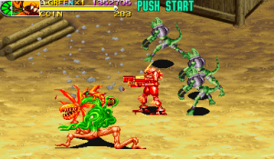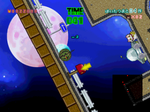 All stages act as flat representations of circular spaces, so that if you shoot at an opening on the right side of the screen, the bullet will reappear from the left; likewise, you can jump down a hole at the bottom and emerge from the top.