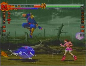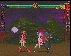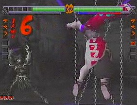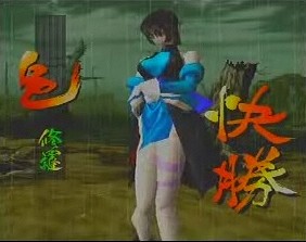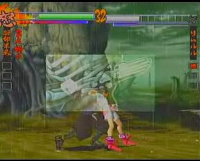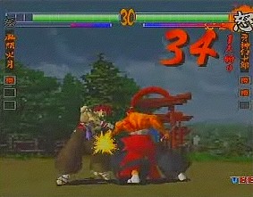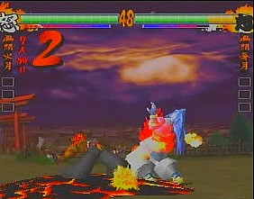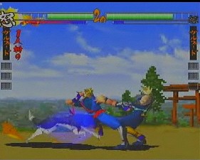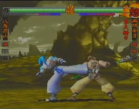 The gameplay has been revamped and refined as well. The 3D movement has been removed and replaced with standard 2D gameplay (similar to Street Fighter EX), although there are still dodge attacks to move into the foreground and background. The 3D backgrounds have been eliminated completely – the backdrops are now two dimensional and scroll infinitely in both directions. Since the stages themselves are less polygon instensive, the character models have been slightly improved and the colors are much more vibrant in the arenas (the level with the Japanese gates and water is breathtaking), and the blood doesn’t look quite so flat anymore. Several gameplay options have been removed, while news ones have been added. Features such as the “Fatal Slash” maneuver have been tweaked with the combo system first introduced in Samurai Shodown IV. Various command attacks, such as “low jumps” and side step attacks have been implemented as well. The super moves have been changed into more traditional flashy combos, ditching the still artwork of its predecessor. Many of them are extremely impressive, almost cinematic in nature, taking advantage of the three-dimension graphics. Asura calls chains out from the netherworld, holds his opponent in bondage, and slashes them repeatedly. Taizan draws huge calligraphy marks that demolish anyone. Shiki strangles her opponent, mounts them suggestively and sucks the life out of them. Hattori Hanzo executes killing blows that shows x-rays of various bones breaking, similar to any number of cheesy kung fu movies.