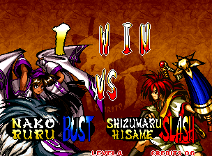 Home ports were released for the PlayStation and Saturn in 1996, although only the PlayStation version came to North America. The Sega Saturn version requires the 1MB RAM cart and is a reasonably decent conversion with only minor animation cuts, although it still suffers from some load times. The PlayStation version is awful – the speed is out of whack, the sound effects are less clear than the Saturn version, and the color palette is noticably darker. There’s no training mode, the load times are unacceptable, the sprites are even more jittery than before, and the character select screen is devoid of animation. The downgraded animations, paired with a dumbed-down difficulty level, make battles much less than impressive. The Neo Geo CD version, like most of the Neo CD ports, is nearly arcade perfect except for the load times, but also includes a few extra voice tracks on the CD with Nakoruru and Rimururu discussing the upcoming Samurai Shodown RPG. In Korea, the game is known as Fighters Swords, and renames Gaira Kafuin to Kim Ung Che. Most of the Japanese speech has been removed as well. The Wii and PlayStation 2 ports as part of the Anthology are nearly perfect, but contain brief load times before fights.
