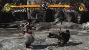 Rage Mode has been changed up yet again. The bar still fills up as a character is hurt, but you don’t have to activate it right away. Pressing the three attack buttons together with a full bar will trigger a Rage Explosion, activating Rage Mode and pushing your opponent away a bit. Like in the classic games, you have increased attack power and can use your rage move as many times as you want, though it wears off quite a bit faster. Unfortunately, some rage moves are nearly useless: Hanzo’s is an unblockable fire wave with huge range, but to make it do any damage takes far too much charging. On the other hand, some are completely broken, such as J’s and Kim’s. There is also an extremely powerful, though not instant-killing, move that all characters can perform: the Fatal Flash. It can only be activated once per round when your health is low. Your character will perform a slow elbow bash with obvious telegraphing, and if it connects, a brief cutscene in heavily desaturated black and white will play. Regrettably, there are no fatalities associated with this move, it leaves you wide open, and it’s practically impossible to actually land in a match. This could have been a legitimate comeback mechanic, but it’s nothing more than a throwaway gimmick. The fighting engine is overall a lot slower and more methodical than Soul Calibur‘s, and while it isn’t as fluid or consistently exciting, it prevents mashing from being a viable strategy, and encourages more thoughtful play. Whiffed moves and turtling are often quickly and severely punished.