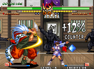 The most prominent addition is the return of the boss characters from all previous games, who are now all playable. Zankuro has been downscaled, Amakusa makes a return from SSIV, and Mizuki from SSII has an upgraded sprite. Even Gaoh is playable. Sadly, there are still omissions in the roster: Cham Cham and Sieger are still missing, not to mention Nicotine and Kuroko. Sankuro and Yumeji are gone as well. Otherwise, the gameplay is pretty similar to Samurai Shodown V.