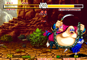 The Genesis version has smaller, less colorful sprites than the arcade version, though things move as quickly as they do in the arcade and the majority of move animations are intact. The Genesis has less on-screen colors overall, but uses a brighter selection that fits the style of the original game equally well. Many of the characters’ animations have been removed or changed drastically, resulting in different moves. For instance, Haohmaru’s fierce slash has been changed into the same animation for his hurricane attack projectile. If you’re using a three button control pad, you’re stuck with an awkward control scheme where the three slashes are mapped to A, B, and C, while kicks are executed with a combination of any of these buttons. Earthquake is missing entirely here.
