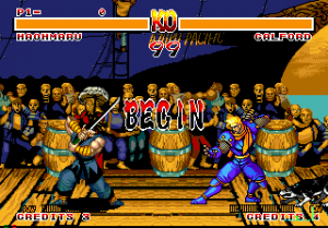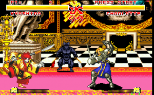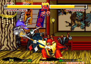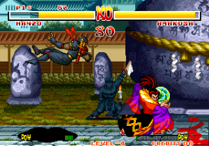 Versions of this game also appear on the SNK Arcade Classics Vol. 1 pack for the PlayStation 2, Wii, and PSP, and the Samurai Shodown Anthology for the PlayStation 2 and Wii. The SNK Arcade Classics versions are a bit choppy, but they’re more playable than the other poorly emulated titles on this package. The Wii version is, thankfully, nearly perfect. Only the original soundtrack is available. There is also a version available for the Wii Virtual Console, which is also just a straight emulation. Strangely, the Arcade Classics pack is missing the arterial blood spray effect but you can still cut opponents in half. In the Virtual Console version on the other hand, the arterial spray is present but you can’t cut opponents in half. Odd. The Japanese Anthology (named Samurai Spirits Rokuban Shoubu) is the best way to go, featuring perfect emulations and both soundtracks without any censorship.