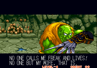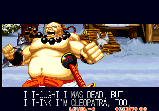 A final interesting note is that much of the dialogue is altered for both home versions. In the Genesis version, many quotes are clearly abbreviated to accomodate the Samurai Shodown font being displayed at a lower resolution in a much smaller text box (literally just two lines of text across the top of the screen). The SNES version however seems to have toned down the intensity of the dialogue rather than just the length. A good example is one of Senryo Kyoshiro’s opening lines of dialogue: “Now in this scene, I rip out his heart.” has become “Now in this scene, you cry like a baby.”