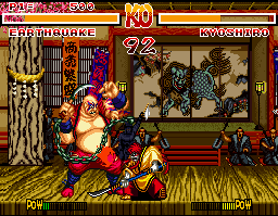 Despite the fact that the SNES usually had the superior versions of fighting games, its version of Samurai Shodown is pretty weak. It has absurdly small and bland sprites when compared to any other Samurai Shodown game and it’s like the whole game is fought in zoomed out mode. The SNES’ color palette is put to good use to mimic the Neo Geo’s lush backgrounds. They hold up quite well, though any animated sprites (Kuroko, the audience in Senryo Kyoshiro’s stage, etc.) in the backgrounds look just as terrible as the playable characters. In addition, many attack animations are removed completely, making for a very unbalanced game experience. While both games move at about the same speed, the Genesis version has noticeably tighter controls that feel more accurate to the Neo Geo original than the SNES version. This, combined with it retaining more moves from the original game (in hit detection if not necessarily in animation) makes for a more fluid experience than the choppy, brazenly stripped down SNES game. The SNES version has the advantage of featuring all characters including Earthquake, although his sprite is barely any larger than Nakoruru’s.