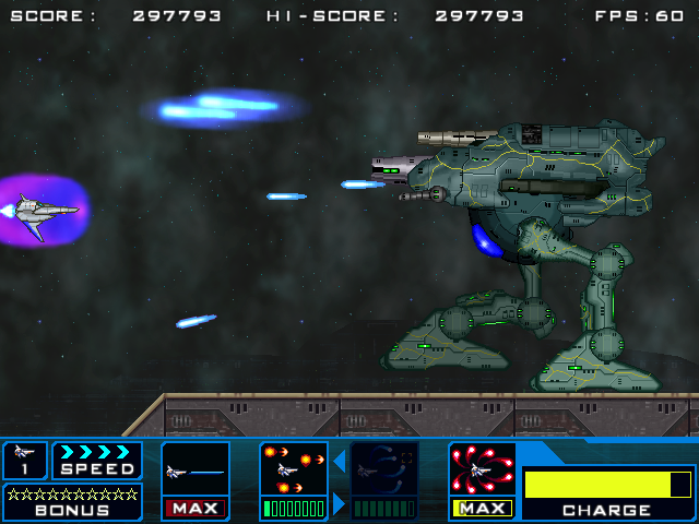 The weapon selection screen looks an awful lot like Gradius, even though the actual upgrade system really isn’t. You select a main weapon (including standard bullets, lasers, and explosive shots), two secondary weapons (which generally fire in multiple directions, including Darius-type missiles and a Thunder Force-style homing weapon, and which can be switched between at any time), and a “charge” weapon that’s extremely powerful but, as expected, comes in limited quantities and must be charged for a period of time before it can be used again.