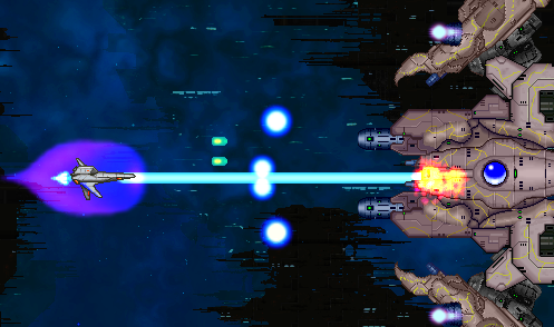 Most enemies are nostalgic, right down to the two-legged walkers and orbs that apparate in great numbers out of thin air, and the bosses come complete with a guarded core that must be destroyed, although strangely they don’t change color as they’re damaged. You’re also chased through a cave by a much larger starship near the end of the first stage, likely an homage to the opening stage of Gradius: The Interstellar Assault, although handled much better here. The final boss looks like the one in Axelay. There are even a few tiny rings of rotating satellites, similar to the one in the first stage of R-Type.