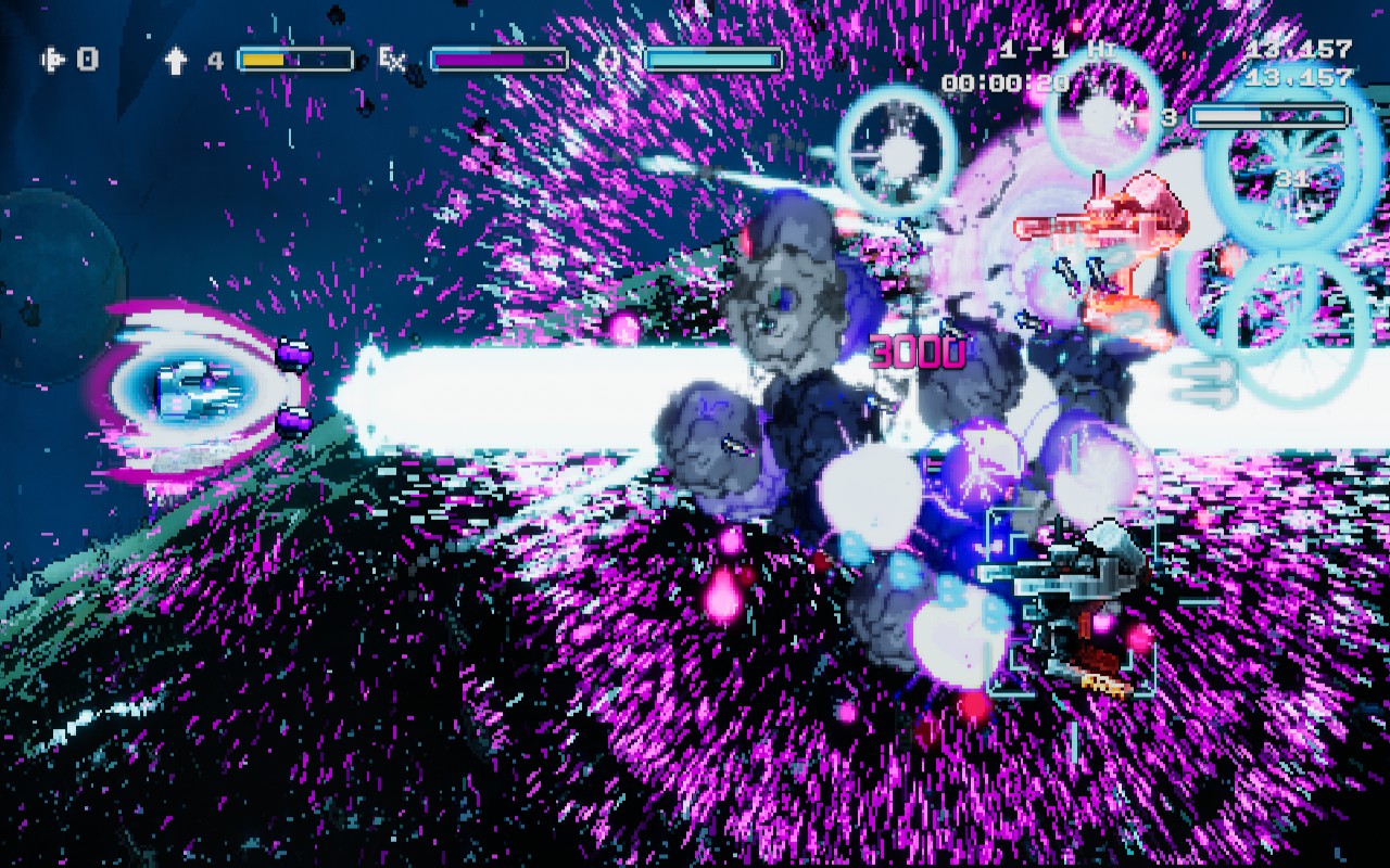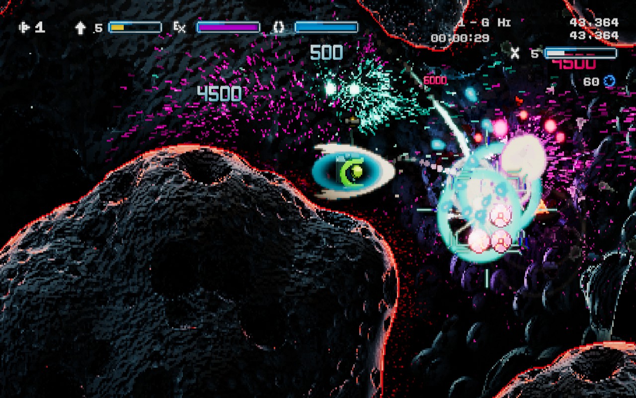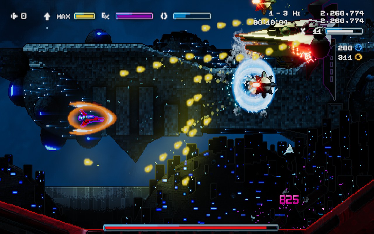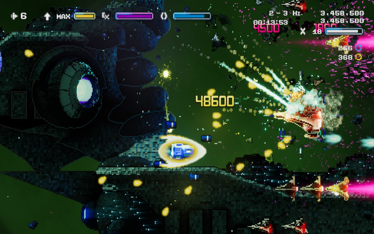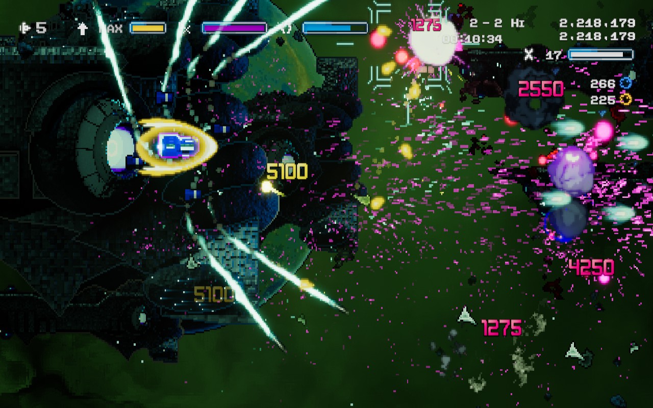 What makes Schildmaid MX stand out is immediately obvious; your goal isn’t to avoid bullets but to fly into them! The core hook revolves around the idea that your ship is powered up by enemy projectiles. The more projectiles you suck up, the stronger you become, and the more enemies you kill, the longer this enhanced mode lasts. Once it runs out, you become vulnerable to everything until a cooldown brings you back to your original state. This mechanic results inthrilling pacing that forces offense or defense upon you based on the current situation. In some cases, it can be best to intentionally leave enemies alive so that they fuel your strength, but you also have to watch that your shield doesn’t run out at the worst time possible. To ensure you don’t get complacent, laser beams and homing missiles can never be absorbed, instead requiring you to use a barrel roll or dodge the old-fashioned way to get them off your back.