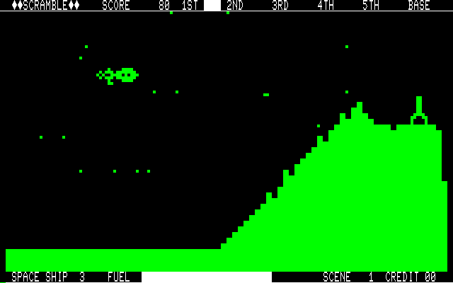 It’s probably unfair to criticize the graphics of a game from 1981, but Scramble is really ugly. This is mostly because the palette cycles through a series of eye-gouging colors every few seconds, which is both trippy and distracting.