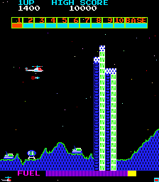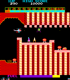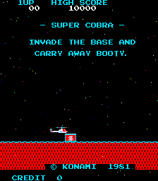 Super Cobra is the sequel to Scramble, although it really just expands on some of the original’s concepts. Primarily, you pilot a helicopter instead of a rocket ship, although it handles the same way. It’s a much harder game overall, but at least you can continue where you left off. Most of the graphics are the same, but there are a few new enemies, and the game is longer, with 11 stages in total compared to six. Also, at the end, you need to grab a briefcase instead of bombing a building.