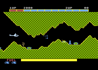 Merely surviving is not enough though. Your ship is constantly running out of fuel that needs to be replenished. Fortunately, the landscape is littered with little FUEL containers, which will mystically replenish a bit of gas when destroyed. Most of the time, these need to be destroyed by your missiles, which drop downward at an arc. The key is, dropped rockets travel along with your ship, sort of like the papers in Paperboy. This might make targeting extremely difficult at first, but a skilled player can use this to manipulate the shots in their favor.