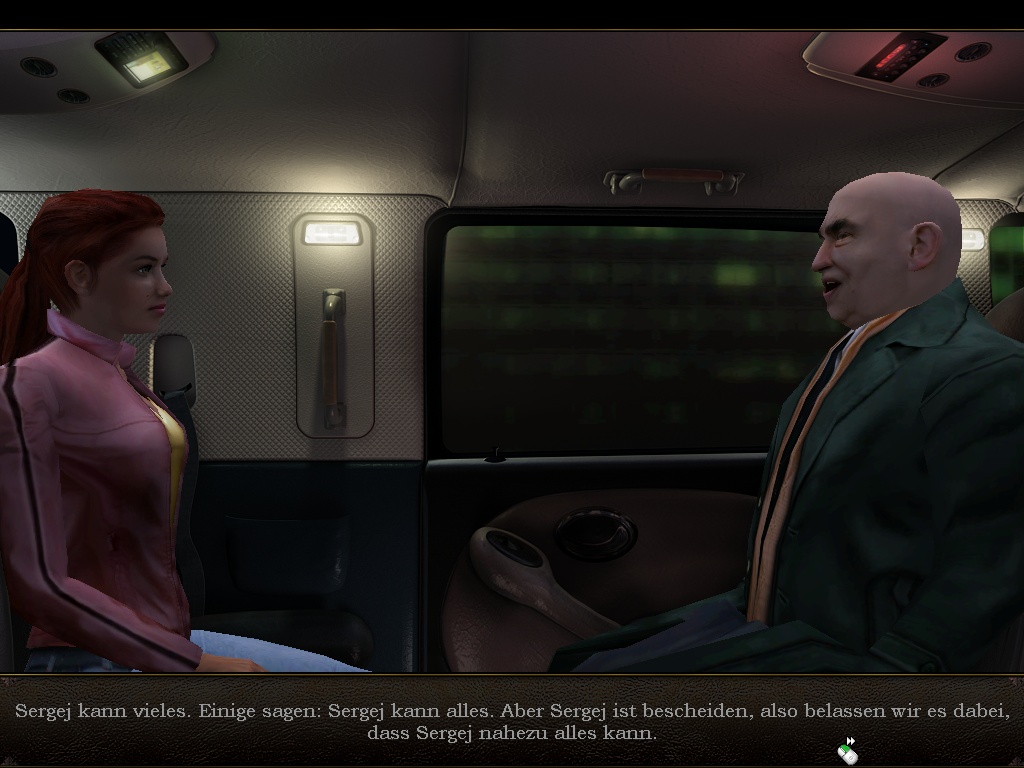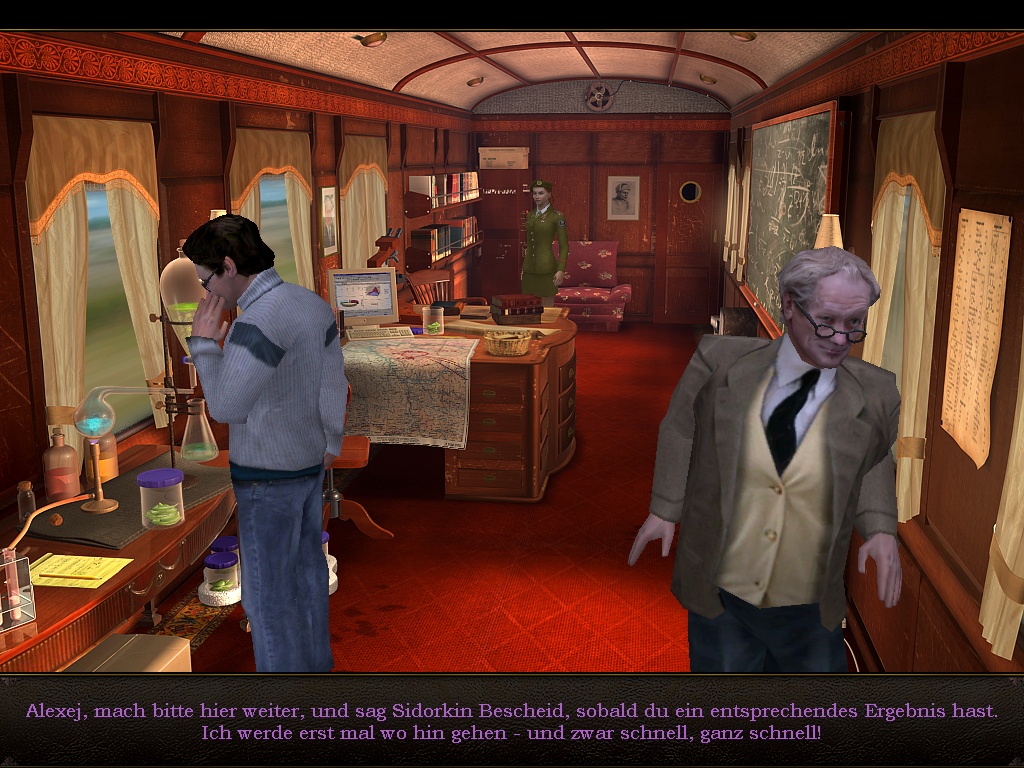 If the puzzles are the meat, the writing serves as the flavoring in the art of adventure game cuisine. And this is sadly the point where most recent attempts fall short. Secret Files: Tunguska has its issues in that department, too, but it’s not a total failure. The two heroes, especially Nina, are written as a pair of loudmouths and smartasses, and the writers felt obligated to make them comment on everything with a clever, funny observation. The humor in these lines is pretty hit-and-miss, and loaded with pop culture references. Max and Nina are noticeably genre-savvy, not only for adventure games, but also mystery and spy thrillers. This makes for some rather nerdy comedy, which could have used a little more subtlety regarding its references. The main plot itself, however, is written consistently well and the mystery case is genuinely intriguing until right before the end, when it pulls an Indiana Jones and an X-Files at the same time and becomes almost stupefyingly insane. A patch for the game (which was included in the English retail version) vastly extends the ending, but did little to make it make sense. The low point of the writing is definitely the “romance” between Max and Nina, though. It just comes out of nowhere after ten lines of dialogue between the two and feels wildly misplaced. Here the writers definitely should have taken more time to actually develop their relationship.
