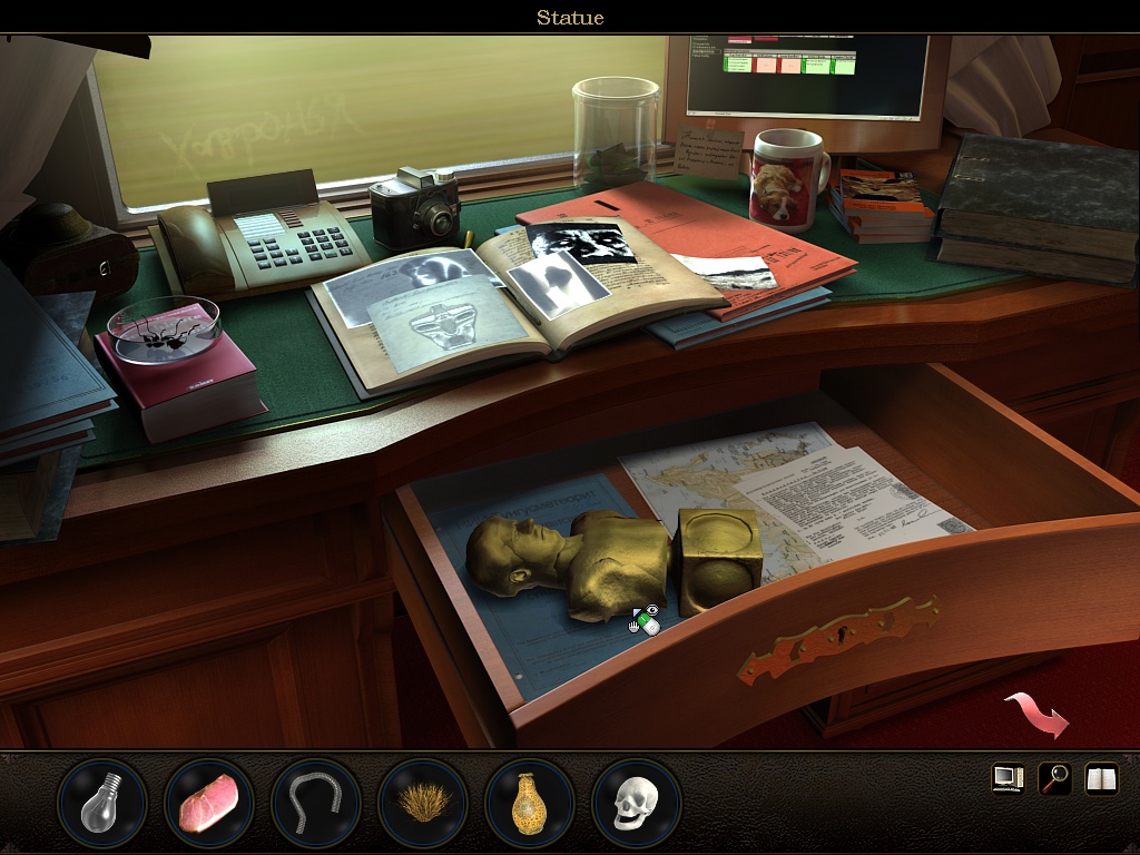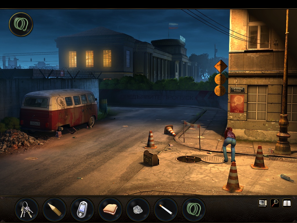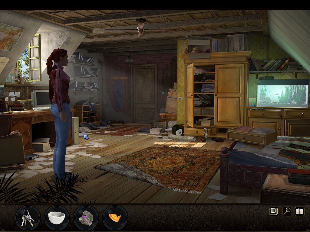 Tunguska‘s basic controls are exactly that: basic. A left click triggers interaction with any object or person, while a right click is for observation. Nina’s walking speed is rather slow, but thankfully the next room can be usually accessed instantly by double clicking on an exit. Items can be used and combined like in any other point-and-click adventure, so there are no surprises here. The novelty of the control system lies with its options to aid the player in times of cluelessness. One of Secret Files‘ big advertisement points was the “Snoop Key” feature. Pressing the space key will mark every hotspot on screen with a magnifier icon, sparing the player an elongated pixel hunt. Purists may dismiss the feature, after all searching for the right objects to interact with can be part of the fun in an adventure game. Detailed high resolution background nowadays tend to make that search a major pain, though, and Secret Files would annoy as well with some nearly invisible items if it weren’t for the Snoop Key.