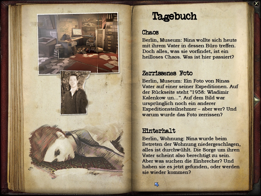 Matters are further simplified by the fact that those items that can be combined with each other are recognizable as such from the beginning. So after selecting one of the items in the inventory one just needs to hover over the bar to see immediately which combinations are possible. On one hand, that saves the player a lot of tedious experimenting when stuck, but also seems a bit lazy on the writer’s part. In truly great adventure classics, making the characters comment on stupid actions can be almost as satisfying as progressing, after all. Equally streamlined are the dialogues. There are hardly ever more than three or four topics to choose from during the course of an entire conversation, with very few “useless” lines. In case one misses or forgets any details, important findings are recorded in a journal, which oddly is written in the third person, despite being designed like an actual personal journal. The journal has also an additional hint system built in, but it doesn’t work as well as the other features.