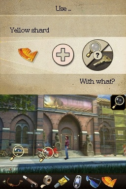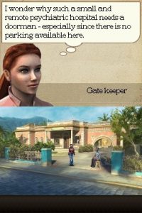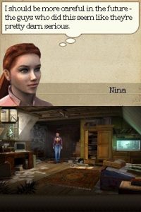 The Wii version runs in a lower resolution, but still looks mostly similar to the original. It offers 4:3 and widescreen modes, the former resulting in cropped backgrounds that require scrolling even when they fit on one screen on the PC. Additionally, Nina can be controlled directly with the Nunchuk. Backgrounds on the DS look surprisingly good, but the characters are hardly recognizable. Instead, their faces are displayed as still images on the upper screen during dialogues. As there’s no right clicking with the stylus, the desired action has to be selected with an extra click. The biggest difference in the portable version, though, is the lack of voiceover. At least with the English version, this isn’t too big a loss.