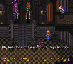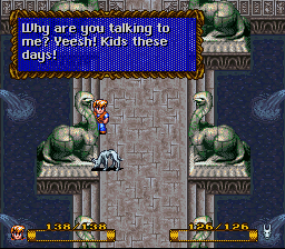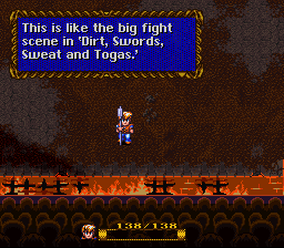 Still, there are a lot of little details about the game that are both intentional and useful, while some are just interesting. You know how some games have a little extra after the screen showing “The End”? Well this game has an extra after an extra after an extra. The coolest secret, however, is the town crier in Nobilia. If you speak to him enough times, he’ll exclaim that “this is all a videogame!” in a fourth-wall breaking display of lucidity. He’ll then say that if he’s lying, the powers that be (you, the player behind the controller) should strike him down. You then get the choice to turn him into a goat, a chicken or a basket. If you decide to spare him, he’ll give you a better piece of armor. Funny AND useful. Turning the man into a basket is even funnier (The comment from the guy next to you is: “Hey this guy isn’t a nut case! He’s a basket case. Get it? BASKET CASE! Ha!”). Also, there’s another Final Fantasy cameo in the game: if you look closely at the crowd during the fight in the coliseum, you can spot Relm, Mog and other character sprites straight from Final Fantasy VI.