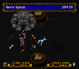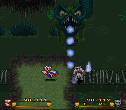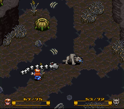 The visuals of the game are quite good compared to other games on the SNES (but it was also released towards the end of the console’s lifetime). The color palette uses a lot of darker or earthen tones so it’s a game that’s a lot less colorful than Secret of Mana. The darker tone is very deliberate, however, as the overall intention seems to make the environments look more realistic, as much as they could be on the SNES. The “realistic” graphics blend quite well with the ambient soundtrack of the game. Plus, every area does strive to respect the historical theme it’s supposed to be in. Well… everybody knows that dragons went extinct just after the Middle Ages and that mummified cats and minotaurs were everywhere during Antiquity, right? If anything, Secret of Evermore should get a medal for actually having enemies that are even remotely appropriate to their setting. One thing that is annoying, though, is that many of the villager sprites seem to repeat ad nauseam (what’s that guy with a toga doing in Gothica?) All in all, the game has a much more American style to it, which was apparently one of the requirements specified by the powers that be at Square headquarters in Japan.