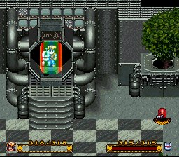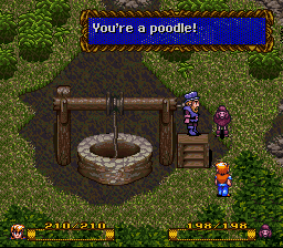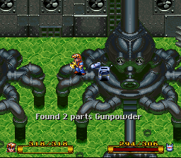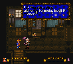 Alchemy is Secret of Evermore‘s spin on magic and one of the game’s defining characteristics. Each formula requires using up a certain quantity of two different ingredients (or “parts”) to produce the usual RPG spells (the holy trinity of magic – attacking, healing, buffing). New formulas can be found by meeting alchemists. You can only equip nine formulas at a time, but most alchemists will let you switch between those you have already learned. You can find ingredients (water, grease, wax, feathers…) by buying them in stores or the dog can sniff out some on the ground almost everywhere in the world. Levelling up formulas requires casting the spell again and again, so this can get both costly and tedious (although you really don’t have to do so, since finishing the entire game requires very little grinding). Some of the formulas are really well hidden and require either luck or a guide to actually find (there’s an alchemist hidden somewhere in an oasis in the desert… good luck finding him).