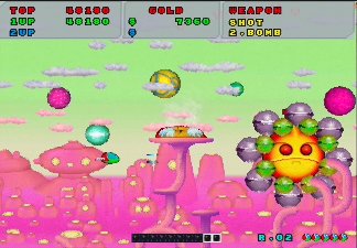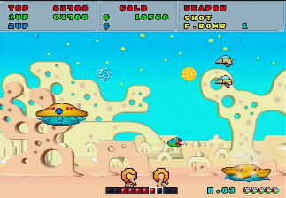 The remixed music tracks are quite good, and the brand new announcer spouts a variety of ridiculous phrases when you start the game or when you die. "Welcome to the Fantasy Zone - Get Ready!" is back, along with some other goofiness like "Get busy, Harrier! Dragon Land is screaming!". There's now a lock-on laser similar to Panzer Dragoon, which is mostly useless, along with limited-use rapid fire button. You can also get bombs to clear the screen, which is actually a nice enhancement, except it makes most boss battles too easy. There's a bit of slowdown here and there, but it's not overly disturbing.