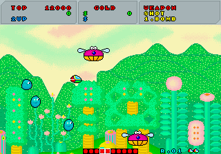About the Sega Ages version - Fantasy Zone is one of the only early Sega Ages titles that manages to take the visuals into the third dimension while remaining faithful the original. The new 3D graphics are cel shaded, and while they're a bit jaggy, still manage to look pretty impressive. The "Arcade Mode" plays just like the original game, but the "Original Mode" adds in short pre-level pans that show off the 3D effects, as well as over-the-shoulder bonus stages when you defeat a boss. All you do is dodge obstacles while the boss vomits coins before falling apart, but it's cool to actually see these 2D objects rendered in 3D without ruining any of the original game. The only potential knock is that none of the music is arranged, and is taken straight from the arcade version. Given how catchy the soundtrack is, even in FM synth, this is hardly much of a negative. There are also four brand new levels added to the main game.