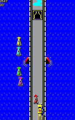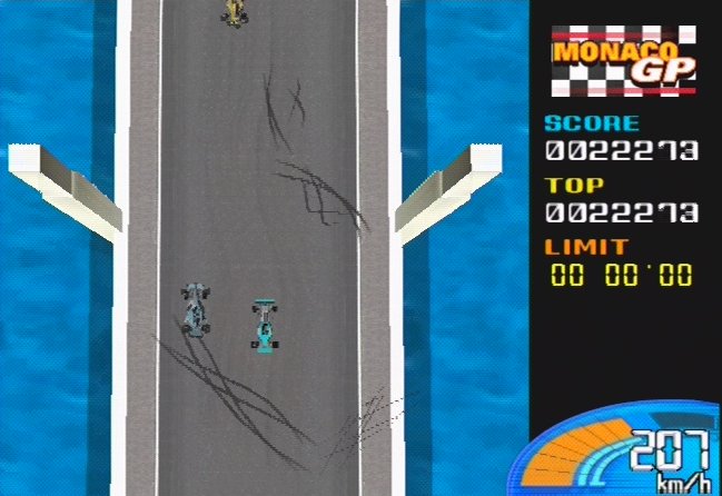 What is it? - An overhead racer released in 1980, and feels like a definite predecessor to Spy Hunter, although without all of the nifty gadgets. Apparently since it uses logic gates instead of a CPU, it's been termed nearly impossible to emulate, so don't go looking for the original on MAME. The closest you can get is a either "simulator" that appears to have dropped off the face of the planet, or the port on one of the Sega Ages Saturn Memorial discs.