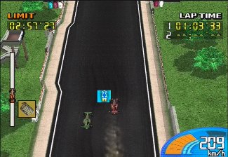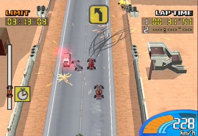 About the Sega Ages version - The Original mode mimics the original arcade game, with an overhead camera, a single, straight track, and limited lives. It's good stupid fun, especially since the action is so blazingly fast. But it's hardly worth more than a few minutes investing in, especially since death comes quickly and usually without much notice. Far more interesting is the Grand Prix mode, which expands the game over fifteen different courses. This version includes multiple camera viewpoints (all overhead, the angled views give a much better look at the race track), power-ups, and a jump button (!!). The roads are littered with stars, which rack up a combo meter and increases the speed of your car. The tracks actually curve too, instead of just being a straight line. You have to take corners by using the trigger buttons, which is a bit awkward. You can crash as much as you like, although you're on a timer. It still feels like surviving is more a matter of luck than skill, but in both modes, it's still a lot of fun to watch cars chaotically bounce around and explode. The cheesy hair metal and split screen multiplayer (with up to four players) are the icing on the cake.