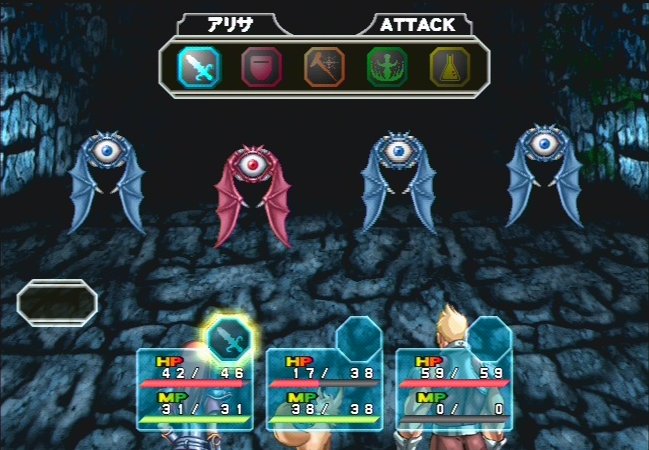 The dungeons are still first person, although the 3D polygons somehow look substantially worse than the awesome scrolling from the Master System game. At least the movement is smoother, and the dungeons look different this time, instead of consisting of the same brick patterns. New is the Atlas item, which displays an automap for 100 steps, making exploration a bit easier. Unfortunately, the first person viewpoints when talking to people or buying things have been ditched completely. You can now save temporarily at any point in the game, but need to use save points in towns for permanent saves.