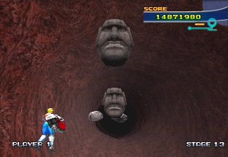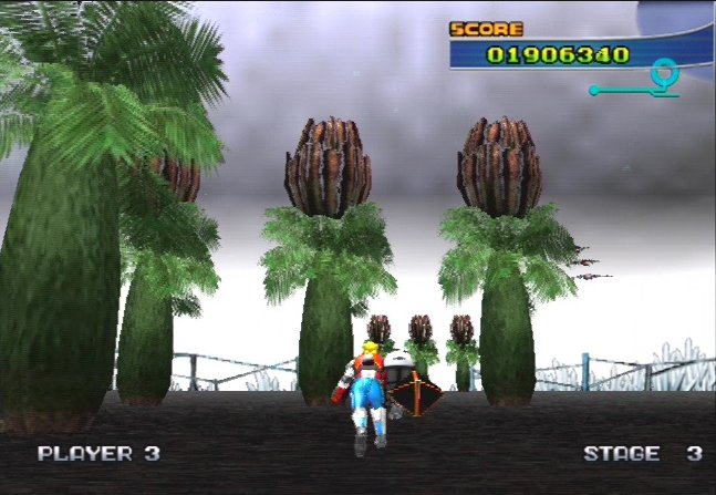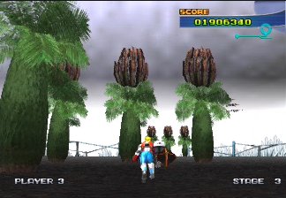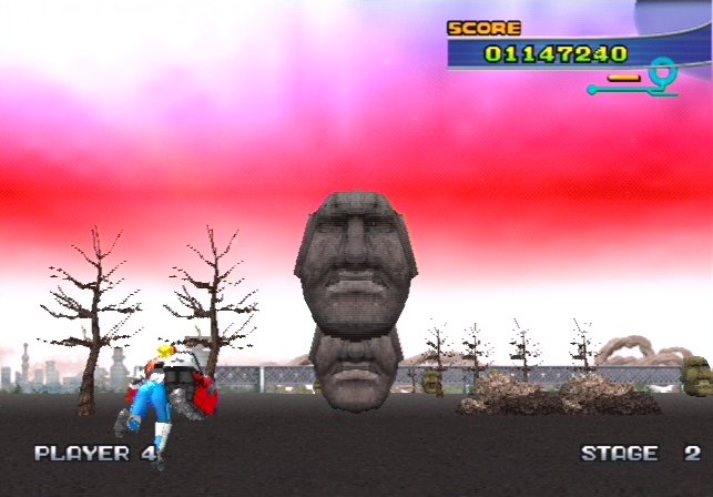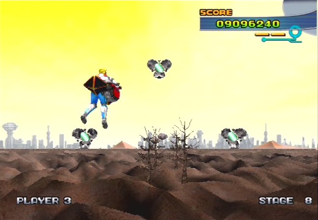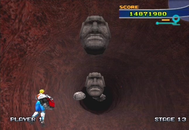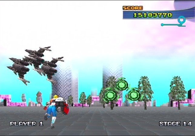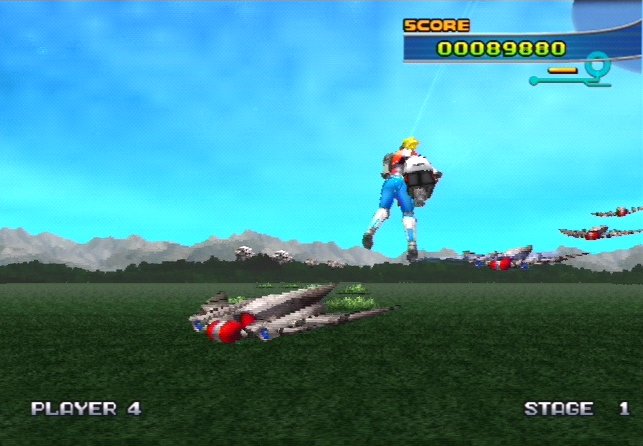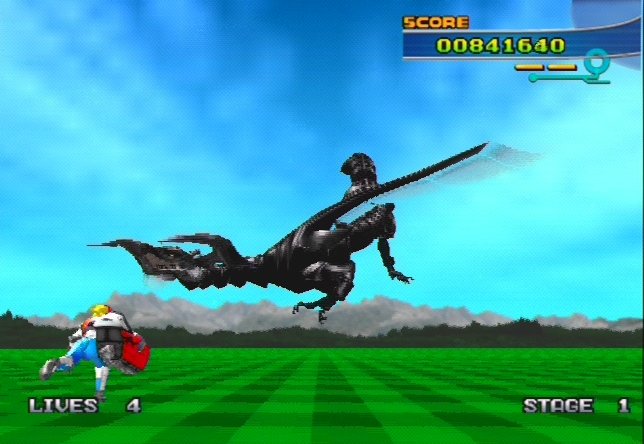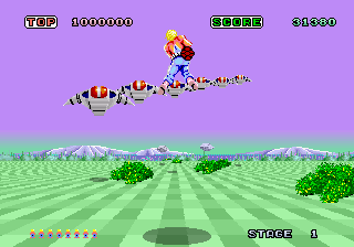 About the Sega Ages version - The redesigned look of the main character (dubbed the "Harrier") is pretty stupid, with his silly goggles and spiky blond hair, but once you get beyond that, this is a pretty good remake. The graphics are a lot darker and lose a lot of the bright color that made the original so attractive, but since the objects here are actual 3D objects instead of 2D sprites being scaled, it gives a better impression of depth and scale. Plus, in the original game, all of the boss dragons were made out of individual segments that scrolled in unison, giving the illusion of a flying beast - impressive for the time, but a bit ridiculous now. Here, they actually kinda look like dragons.