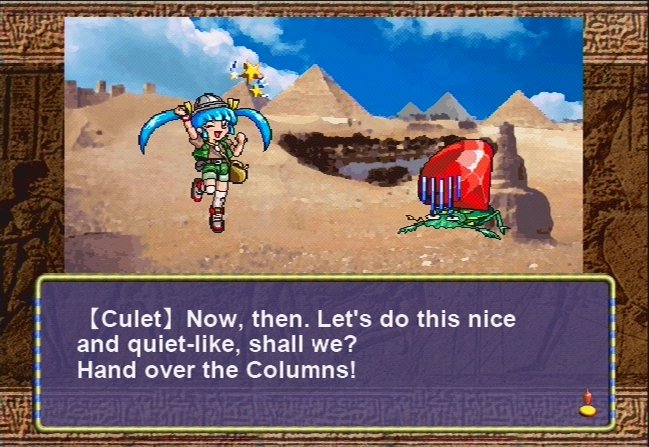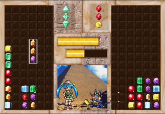 About the Sega Ages version - The original mode seems practically identical to the arcade version. I guess the 2D graphics have been cleaned up a bit, but they're so dark it's hard to tell. It also uses the same appalling music as the arcade game. The updated version features a cleaner looking playing field and 3D animated spinning gems, as well as a much better song. There's also a Vs CPU mode, which tries to inject a Puyo Puyo-style story into the game - you play as a young blue haired girl named Culet, squaring off against various Egyptian animals, in a search for the missing museum exhibit named, not coincidentally, Columns. These versus games are still too slow paced to be fun though.