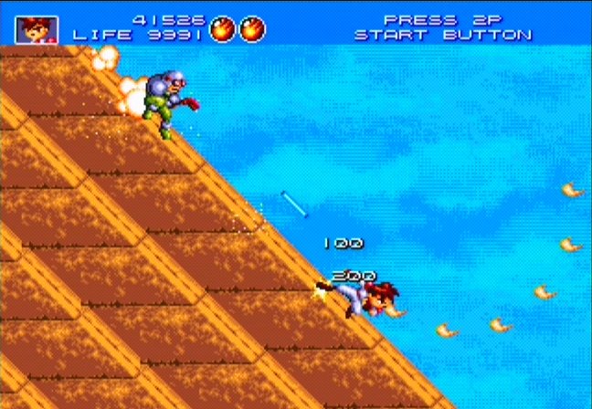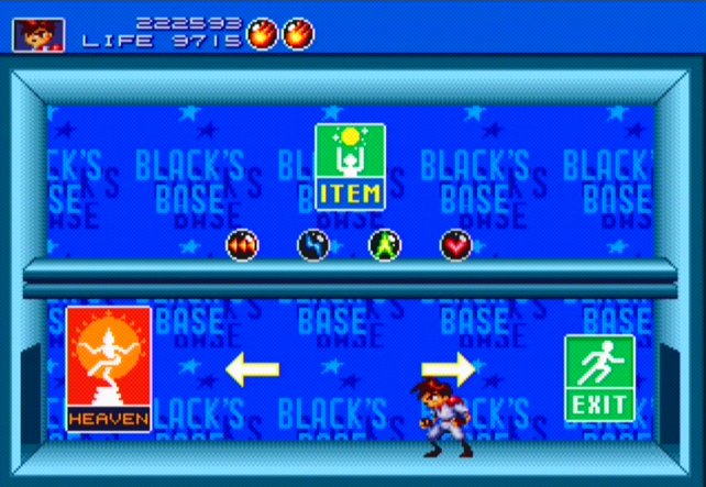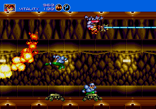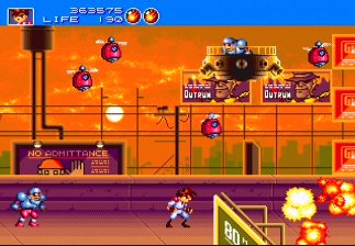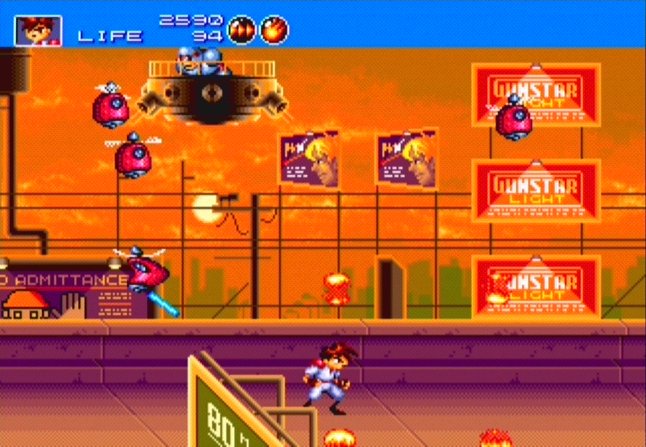 About the Sega Ages version - This includes the same emulator found in the Space Harrier collection, which means lots of options to tinker with. There are still issues with the sound emulation, as the music won't sound quite right if you've spent a lot of time with the original hardware, but it's definitely tolerable. Again, there are extensive galleries with pictures of all versions from all territories, including full manual scans and a lot of cool concept art for Gunstar Heroes. You can also unlock the original design document, which has all kinds of trivia. (Just beat the game, and make sure you're playing the "JAPAN" version and not the "OVERSEAS" version.) Two initially planned names included "Lunatic Gunstar" and "Blade Gunner"; the double flame weapon was initially supposed to be a dragon; and each gem was supposed to grant extra powers when collected and equipped.