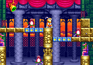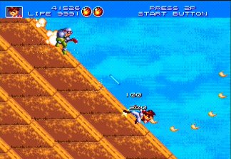 Even more interesting is the Prototype version, which is kind of a secret - much like the hidden Space Harrier games, you need to get to the region selection option, highlight "Overseas" and hold right for a few seconds until it shows up. While it's basically the same, there are a ton of tiny little differences that hardcore fans can point out. There's a lot more hilarious English featured in this version ("BOSS TIME COMING SOON" and "WAITING OF THE DANGER" before fighting bosses, "LIFE OF ENEMY" instead of "BOSS ENERGY", "BREAKDOWN" instead of "BOSS DEFEATED"). There are little score items that appear while you're sliding down the pyramid in Pink's stage, and there's a strange door marked "Heaven" in one of the item rooms in Black's level (which doesn't go anywhere). The heroes also don't grab the gem when you beat a stage. Some of the sound effects and animations are different, as well as altered graphical details - the "Outrun" billboards in the fifth stage are completely different. There's also a cheat to gain 9999 health (just pause and hit X.) Alas, it stops midway through the fifth stage, since this was just supposed to be a preview copy for the press. If this wasn't enough, you can also access the Game Gear version, by highlighting the "Prototype" option and hold right for a few more seconds. Cool idea in theory, but the game's just way too action packed to work on an 8-bit system.