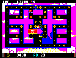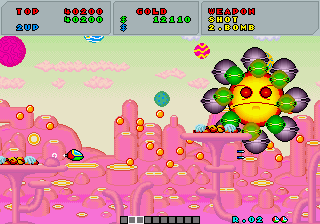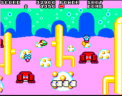 For the most part, Fantasy Zone is an evolution of the classic arcade game Defender - you fly back and forth on a side-scrolling, looping stage. But rather then saving humans, you're charged with destroying a number of enemy bases that appear throughout the stage. Once you've killed them all, you fight a boss, then it's on to the next stage. Destroying enemy also yields cash, which can used to purchase weapons, speed enhancements, and bonus lives. Also, instead of Defender's dark, simplistic graphics, Fantasy Zone is filled with bright colors, rainbows, and overly peppy salsa music.