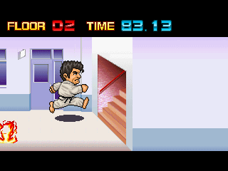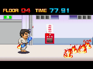 Sanshiro has to dodge various obstacles (fire, collapsing floors, leaking gas pipes) to reach the top of a burning building and rescue the people trapped inside. Reaching the top floor in time unlocks the Burning Rangers commercial.