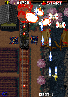 Samurai Aces is Psikyo’s first shooter, and what a debut! Rather than enter the fray with a typical space shooter, Psikyo went off the beaten path with a feudal-esque yet postmodern Japanese setting. While this isn’t exactly original (Compile had already done this with a few of the Aleste games), it’s definitely a refreshing departure from the norm. Aside from the setting, however, Samurai Aces is a pretty standard tate shooter. It’s eerily reminiscent of Nakamura’s previous title Aero Fighters, in both design and visual style (i.e. similar explosions, bomb icons, etc), which makes sense considering that it was developed by the same team of programmers. Almost all of Psikyo’s shooters from here on out would use similar visual styles to Samurai Aces.