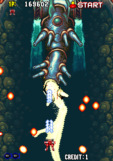 A female ninja who flies an odd-winged ship that looks like something out of Da Vinci’s filing cabinet. Fires streams of kunai that get slightly wider with each power up. Her secondary weapons are some typical spreading missiles. Her bomb is probably the best in the game. She ascends closer to the screen and circles around, causing a storm of cherry blossom petals that damage or destroy all enemies.