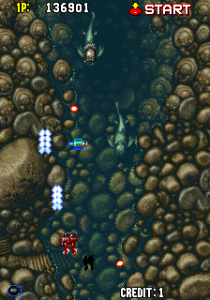 For the most part, Sengoku Ace plays and is structured almost exactly like Sonic Wings. You select your ship and begin blasting through a stage randomly selected from a pool of several, getting powerups and memorizing enemy shot patterns. Fairly standard shmup stuff. The true beauty of Sengoku Ace is in its intense and eclectic pacing, a characteristic of both Sonic Wings and, for the most part, the rest of Psikyo’s shooters. There’ll be times where you’re bombarded with intense bullet-hell tossing enemies for only about a minute before a large boss lumbers into view and then wham, you’re off to the next stage just like that. The game is constantly throwing you around and that makes it pretty hard to get bored.